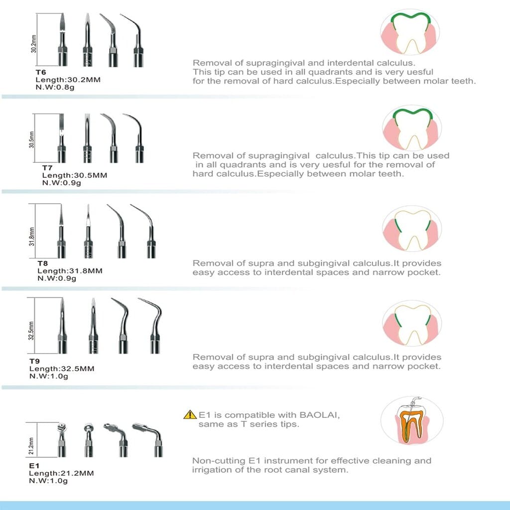 نوکهای (تیپهای) دستگاه جرمگیری اولتراسونیک، رابط مستقیم بین دستگاه و سطح ریشه هستند. مدل E1 از برند Baolai بهطور خاص برای دسترسی به نواحی عمقی و تنگ زیر لثه (پاکتهای پریودنتال) و همچنین کاربردهای خاص اندودانتیک طراحی شده است. طراحی باریک و ظریف آن، امکان نفوذ با حداقل آسیب به بافت نرم لثه را فراهم کرده و در عین حال قدرت پاکسازی موثری را حفظ میکند.