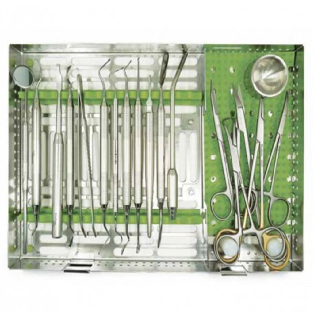 | ابزارهای دسترسی و برش فلپ | • اسکالپل (تیغ جراحی) • پریوست ئالواتور • رتراکتورها (آینه، Cheek Retractor) • قیچی و فورسپس جراحی | ایجاد دسترسی، کنار زدن فلپ، کنترل خونریزی و دید کافی به ناحیه جراحی. |